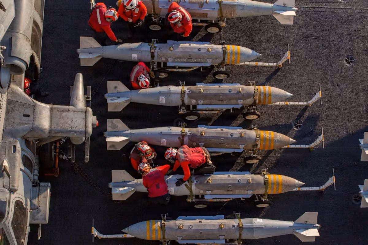 تظهر الصور ذخائر – يبدو أنها من طراز GBU-31، فئة 2000 رطل ذخيرة الهجوم المباشر المشترك – تم تنظيمها في 28 فبراير من قبل رجال ذخائر الطيران ذوي السترات الحمراء قبل تحميلها على طائرات مقاتلة لدعم عملية Epic Fury، وفقًا لصور القيادة المركزية الأمريكية.