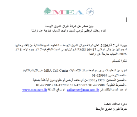 طيران الشرق الأوسط: الغاء رحلات أبوظبي ليومي السبت والأحد | Shafaqna Lebanon
