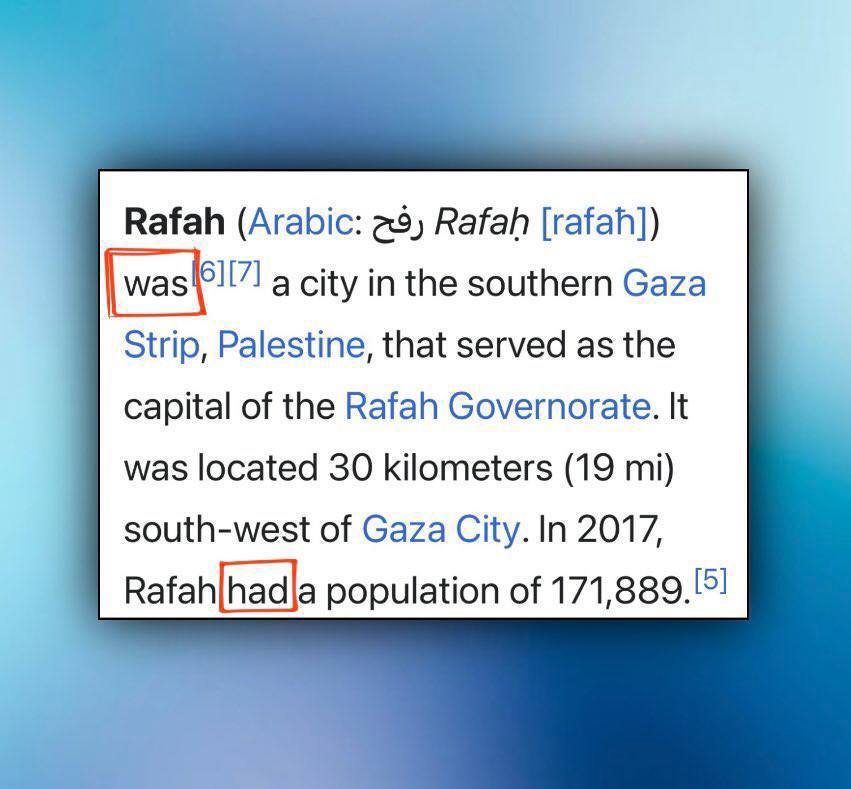 ويكيبيديا تصف رفح بـ”الزمن الماضي”.. مدينة فلسطينية دمرتها الحرب توثَق بصيغة “كانت”