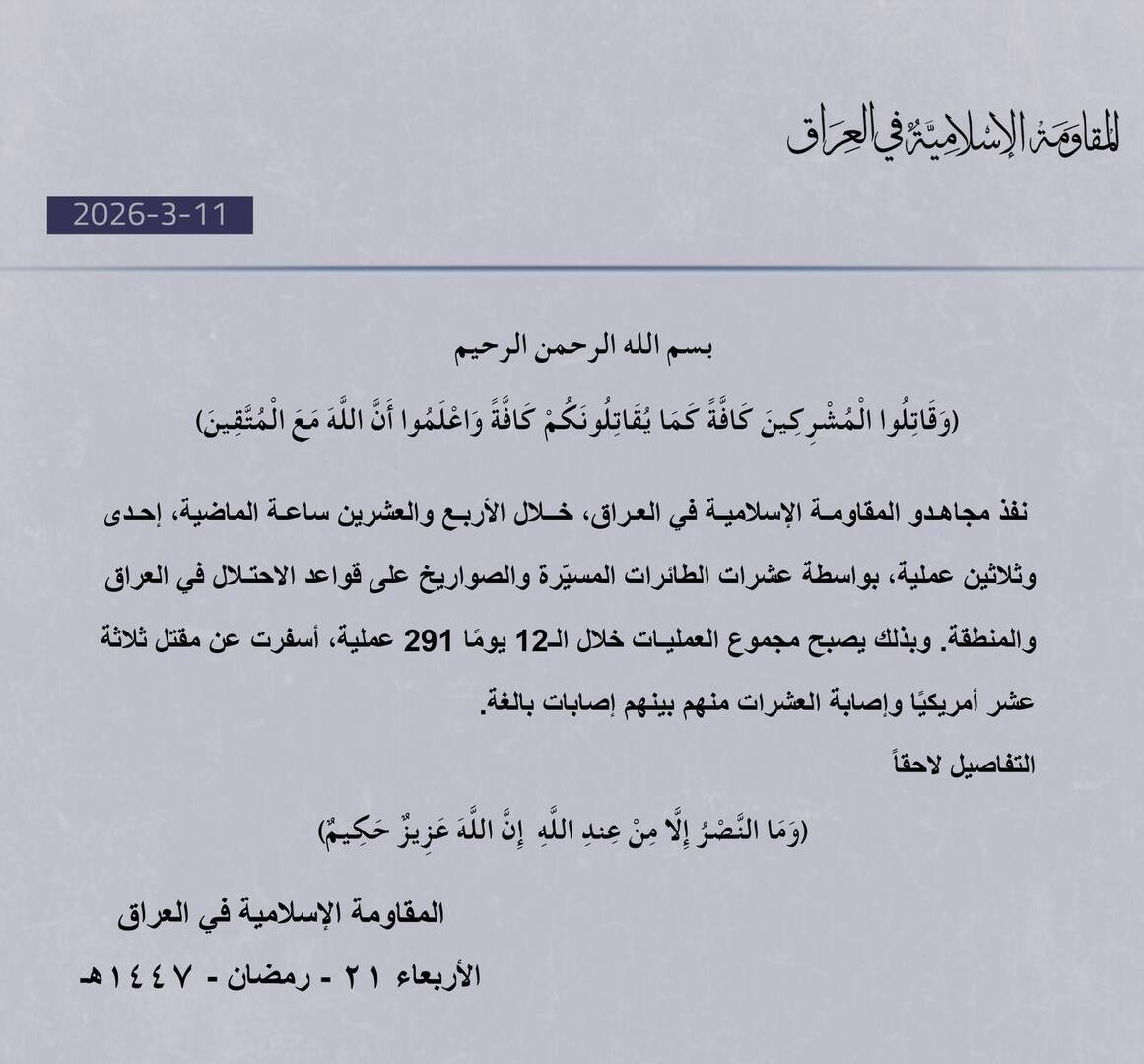وأضاف: “بذلك يصبح مجموع العمليات خلال الـ12 يومًا 291 عملية، أسفرت عن مقتل ثلاثة عشر أمريكيًا وإصابة العشرات منهم بينهم إصابات بالغة”.