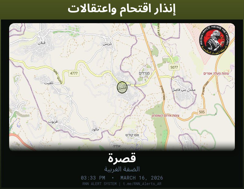#عاجل تم رصد اقتحام واعتقالات في الضفة الغربيةالمناطق المتأثرة: قصرة… تم رصد اقتحام واعتقالات في الضفة الغربية المناطق المتأثرة: قصرة