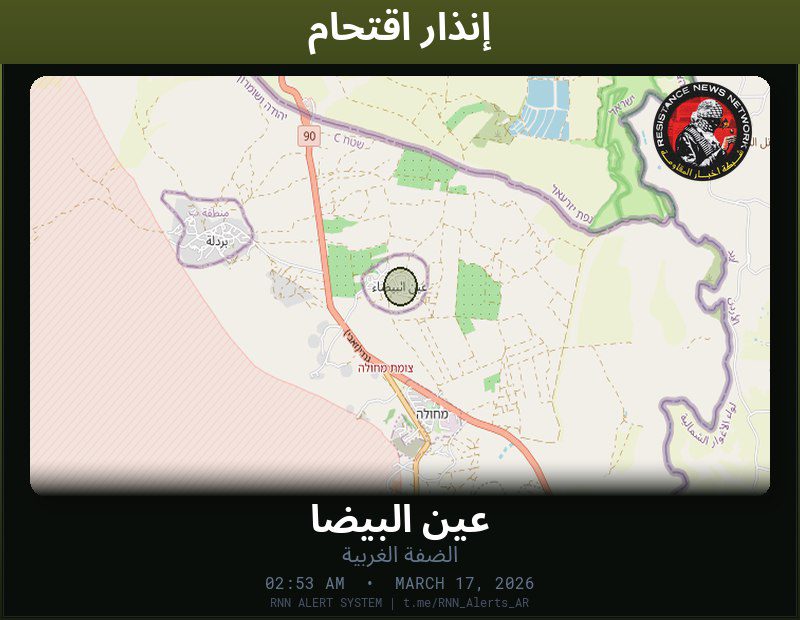 #عاجل تم رصد اقتحام في الضفة الغربيةالمناطق المتأثرة: عين البيضا… تم رصد اقتحام في الضفة الغربية المناطق المتأثرة: عين البيضا