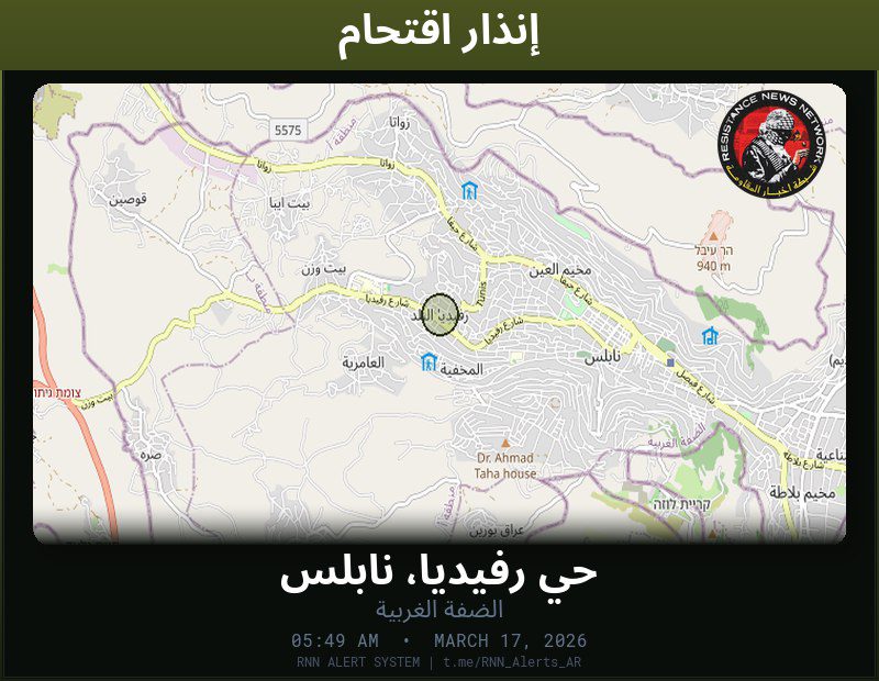 #عاجل تم رصد اقتحام في الضفة الغربيةالمناطق المتأثرة: حي رفيديا، نابلس… تم رصد اقتحام في الضفة الغربية المناطق المتأثرة: حي رفيديا، نابلس