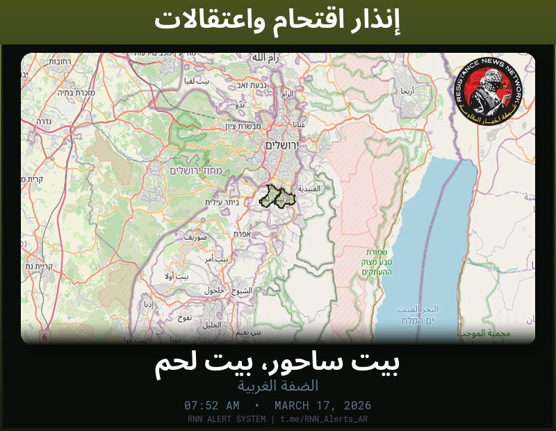 #عاجل تم رصد اقتحام واعتقالات في الضفة الغربيةاعتقال شابالمناطق المتأثرة: بيت ساحور، بيت لحم… تم رصد اقتحام واعتقالات في الضفة الغربيةاعتقال شاب المناطق المتأثرة: بيت ساحور، بيت لحم