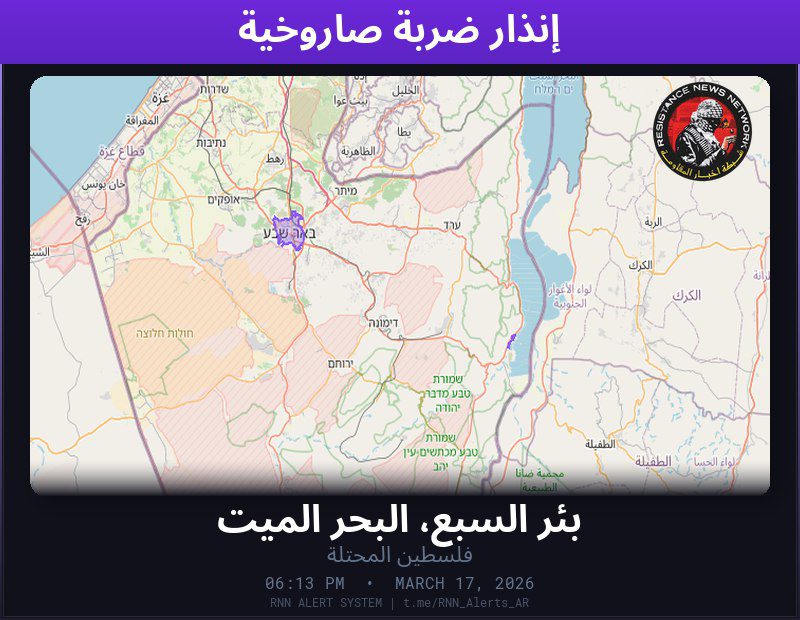 #عاجل تم رصد ضربة صاروخية في فلسطين المحتلةالمناطق المتأثرة: بئر السبع، البحر الميت… تم رصد ضربة صاروخية في فلسطين المحتلة المناطق المتأثرة: بئر السبع، البحر الميت