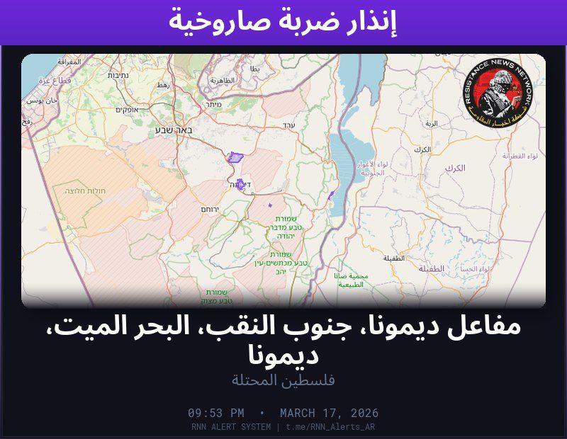 #عاجل تم رصد ضربة صاروخية في فلسطين المحتلةالمناطق المتأثرة: مفاعل ديمونا، جنوب النقب، البحر الميت، ديمونا… تم رصد ضربة صاروخية في فلسطين المحتلة المناطق المتأثرة: مفاعل ديمونا، جنوب النقب، البحر الميت، ديمونا