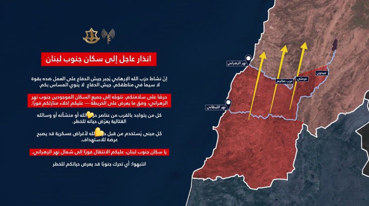 وجّه الناطق بإسم جيش الاحتلال إنذار عاجل إلى سكان جنوب لبنان المتواجدين جنوب نهر الزهراني.