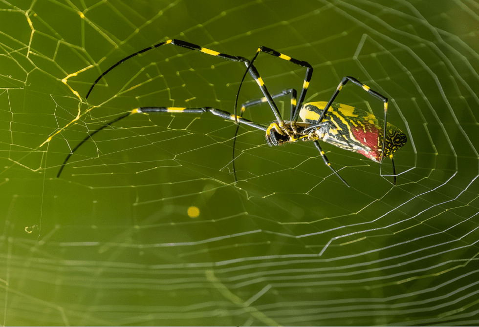 وتتميّز إناث عنكبوت “جورو” بلون أصفر لامع مع خطوط زرقاء وعلامات حمراء، إلى جانب حجمها الكبير الذي قد يصل أحيانا إلى حجم كف الإنسان، في حين تكون الذكور أصغر حجما وذات لون بني داكن. كما تبني الإناث شبكات حريرية ذهبية كبيرة لاصطياد فرائسها، وتزداد هذه الشبكات انتشارا مع تزايد أعداد العناكب.