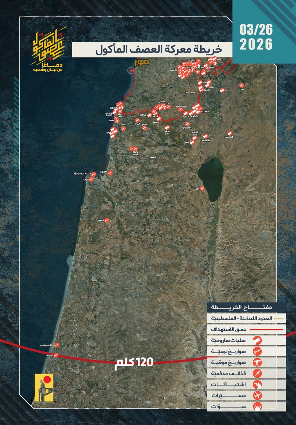 دفاعًا عن لبنان وشعبه، أصدرت المقاومة الإسلامية بتاريخ الخميس 26/03/2026، 94 بيانًا عسكريًا حول عمليات التصدي لتحركات العدو الإسرائيلي عند الحدود اللبنانية الفلسطينية، وكذلك عمليات استهداف مواقع وقواعد وانتشار جيش العدو الإسرائيلي ومستوطناته في شمال فلسطين المحتلة، وفقًا للآتي:
